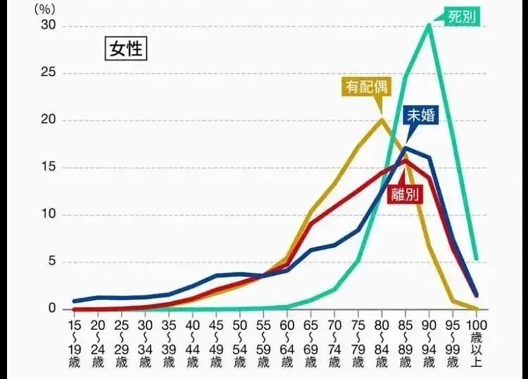 另一项,是日本厚生劳动省给出的数据,数据显示,丧偶女性平均寿命为91岁,是最长寿的群体。