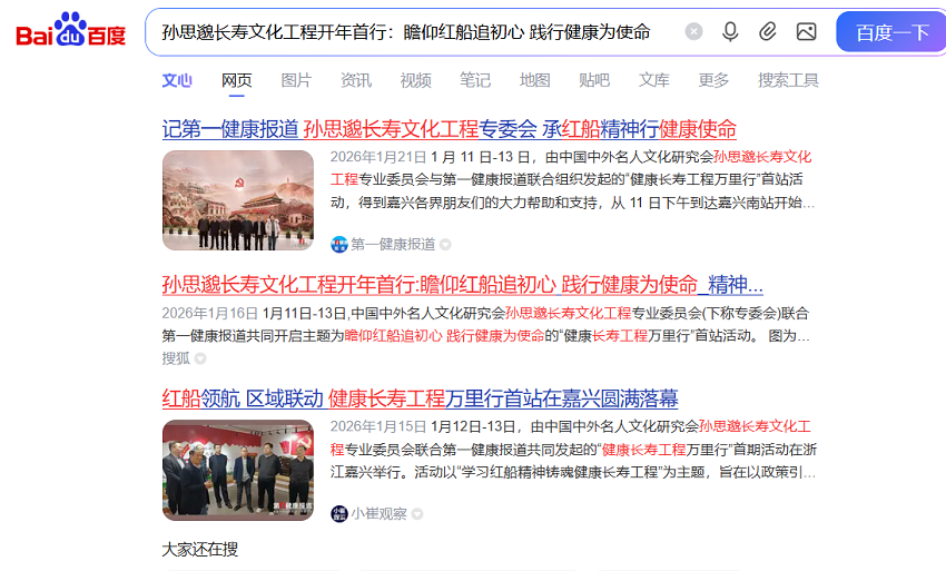 1 月 11 日-13 日,由中国中外名人文化研究会孙思邈长寿文化工程专业委员会与第一健康报道联合组织发起的“健康长寿工程万里行”首站活动,得到嘉兴各界朋友们的大力帮助和支持,从 11 日下午到达嘉兴南站开始,在嘉兴大学杨明泉教 授的精心安排和杨晓松古法中医师的全程陪同下顺利开展,至 13 日上午,完成瞻仰中共一大代表风貌,学习红船精神,重温新中国百年奋斗史的夙愿;实现与嘉兴红船文创,清华长三 角研究院中医科技,嘉兴绿色农业以及大健康各界企业家直接沟通座谈、参访调研的既定目标;13 日中午,专委会、第一 健康报道一行 6 人与特邀嘉宾王国昌教授,赶赴上海参观中共一大会址及其纪念馆。期间,每个人都亲身体验亲自感受了105 年前那段波澜壮阔的近代中国奋斗者们为国家为民族争取独立,改变孱弱,战胜困难,勇于拼搏,矢志不渝,打下江山,最终奠定了民族自强自立的强大精神力量,每个人的精神状态和身体状况受此感染达到极度兴奋,无比欢畅。短短三日出行活动,为 2026 专委会全年工作布局奠定了良好基础,活动取得圆满成功。