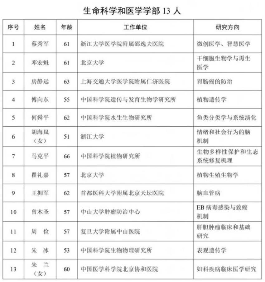 以下为中国科学院“生命科学和医学学部”、中国工程院“医药卫生学部”2025年院士增选当选院士名单: