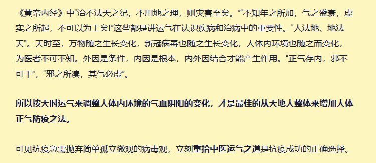 “正气存内,邪不可干”,“邪之所凑,其气必虚”。只有按天时运气来调整人体内环境的气血阴阳的变化,才是最佳的从天地人整体来增加人体正气防疫之法。